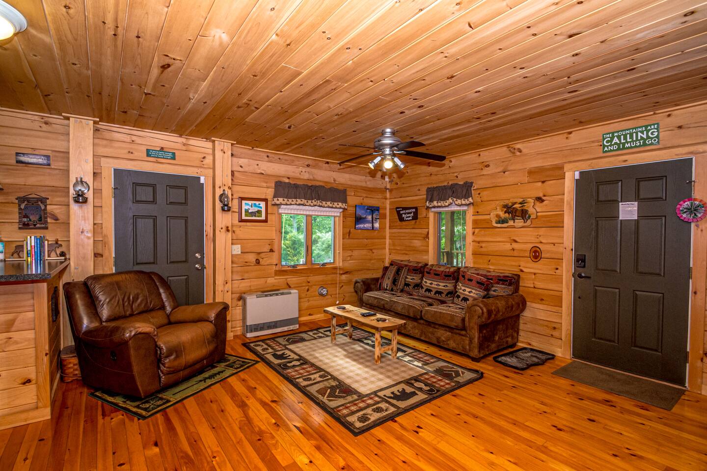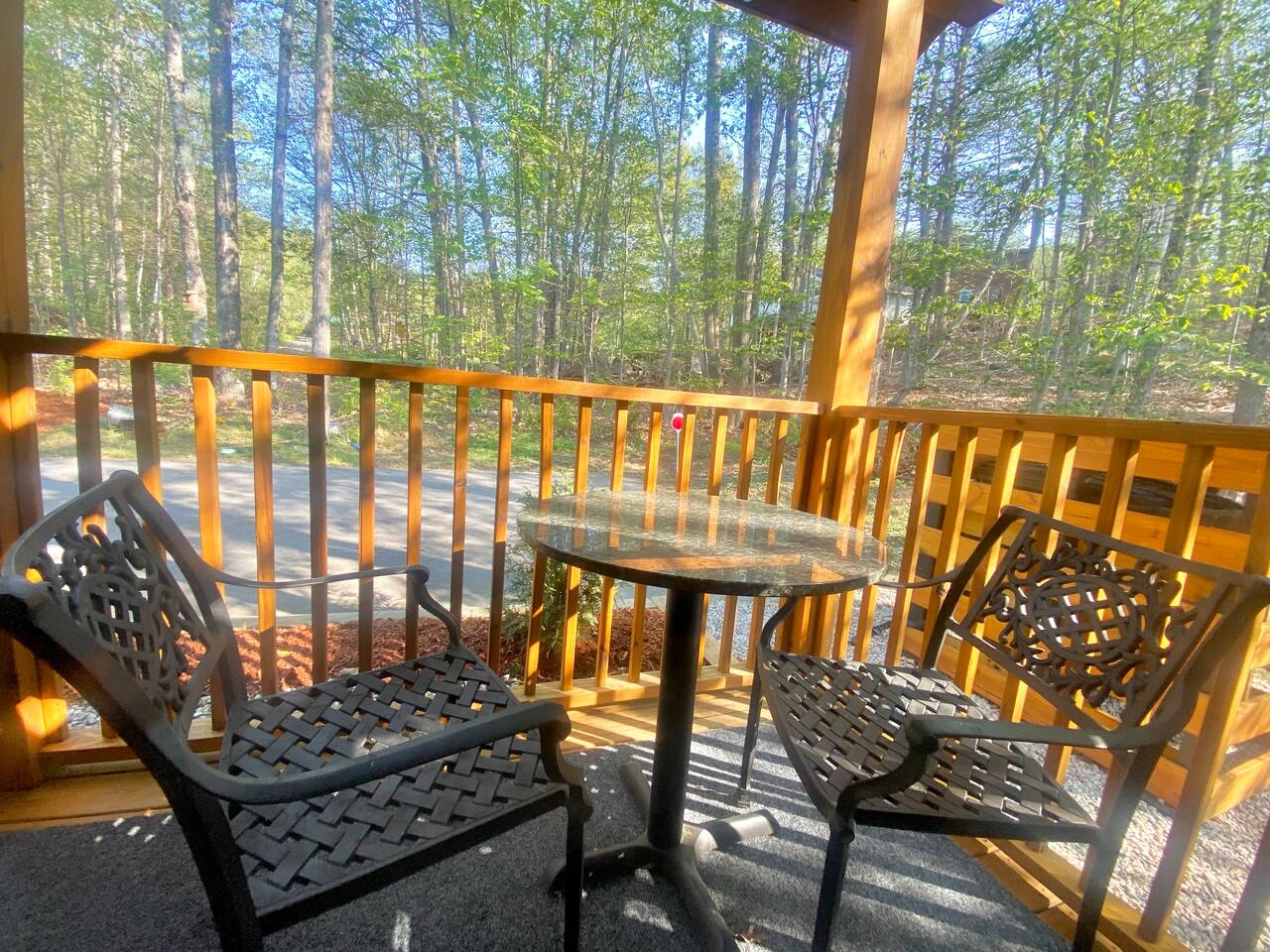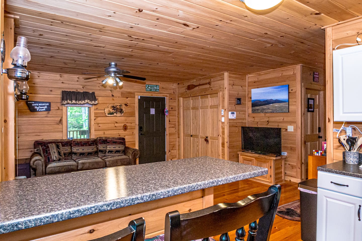 Our log cabin is situated on paved backroad on 1/3 of a wooded acre in the town of Intervale. There are other mountain homes located on both sides of our log cabin, and behind us. All of our neighbors are very nice, and it is a quiet neighborhood. Please note: You will be able to see cars driving on Dundee Road from the cabin, especially during busy weekends but you rarely can you hear any noise from inside the cabin. There are woods in front, left side, and right side of our cabin. For the neighbors to the left and right, you can partially see their houses by looking through the trees in the spring/summer months which gives the our setting some privacy during these seasons. The neighbors home are more visible in winter months when the leaves have fallen off the trees....but it's generally too cold to be sitting outside during that time anyway. Our cabin is close to many hiking trails, ski areas, shopping, dining, and mountain biking trails. It's a 30 minute walk or 2 minute drive to the river, where you can bring your camp chair and relax.